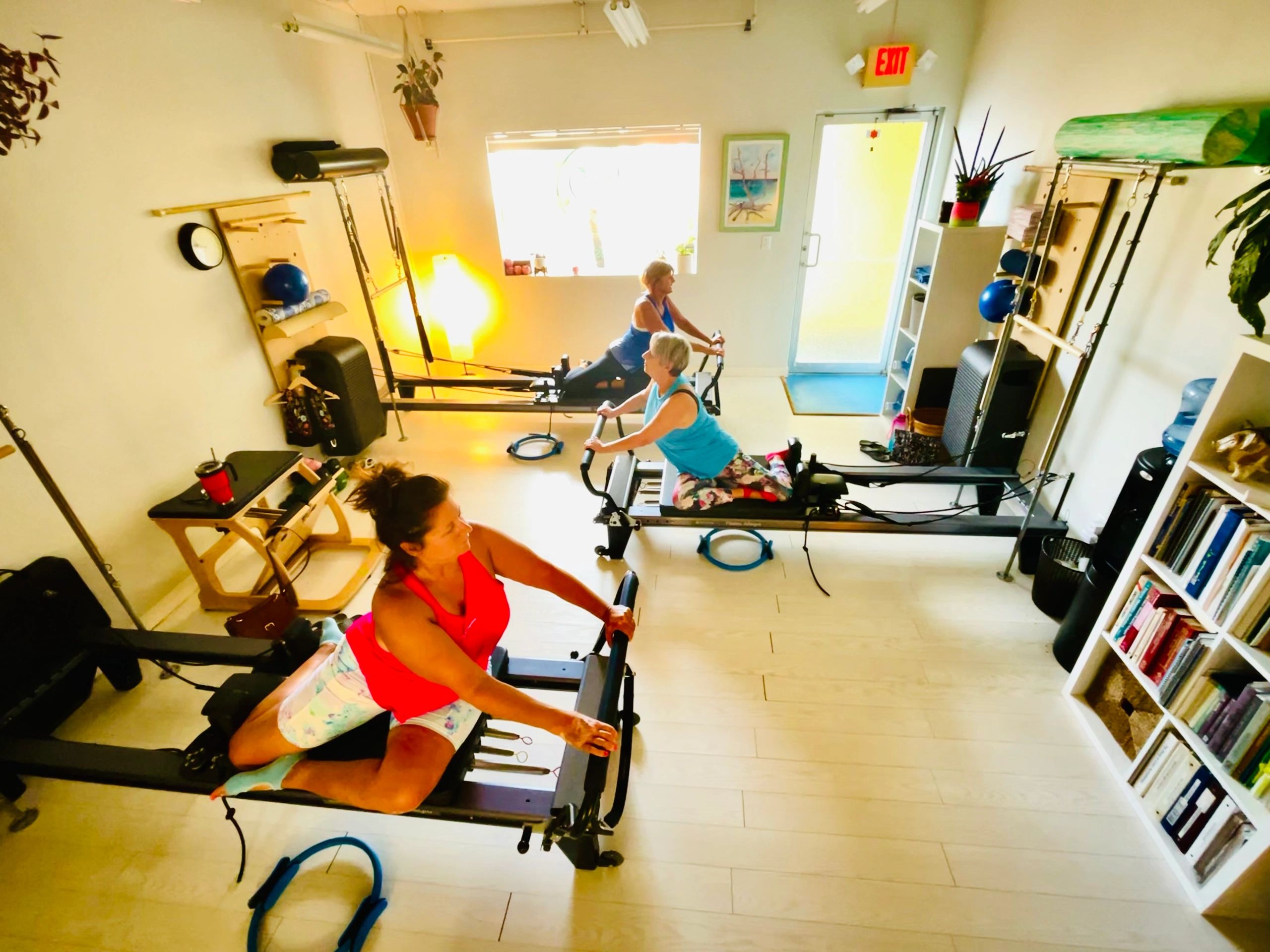 Casual group reformer is what I aim for in the classes. I don't require socks, but if you like them please wear them. I have extras too. Please come prepared to focus AND be light hearted. The reformer classes fit six reformers and are taught at a beginner/intermediate pace, unless specified on the schedule.